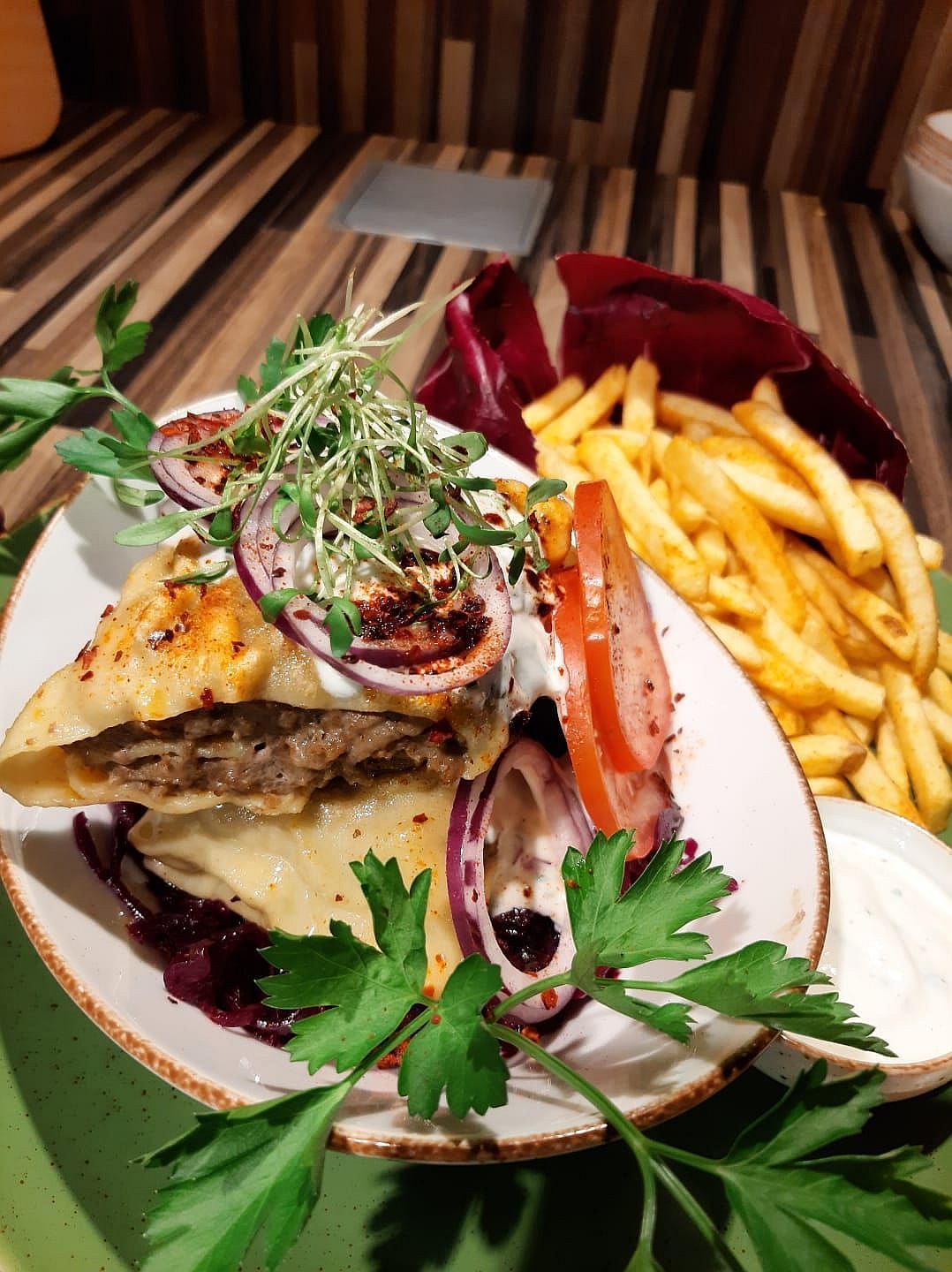 Und für alle, die Lust auf etwas Besonderes haben: Unsere Döli verbindet kräftige Würze mit schwäbischer Handwerkskunst – serviert auf frischem Rotkohlsalat mit Joghurtdip, roten Zwiebeln und auf Wunsch mit feiner Schärfe.